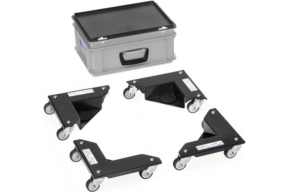 Stahlblech · Gehäuse aus geschweißtem Stahlblech für höhere Tragfähigkeit · Tragfähigkeit 150 kg pro Stück · 3 Lenkrollen TPE-Bereifung, 50 x 18 mm, auf der Stelle drehbar · Naben mit Fadenschutz und Rillenkugellager · B 361 x T 177 x H 87 mm · Ladehöhe 16 mm · Gewicht pro VE = 10 kg · Für den sicheren Transport von Möbeln oder anderen kastenförmigen Gegenständen. Extra niedrige Ladehöhe. Ladefläche mit Anti-Rutschauflage.Weitere technische Eigenschaften: