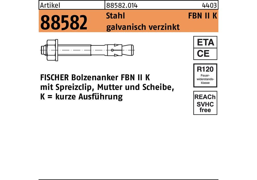 Artikel 88582 Stahl FBN II K galvanisch verzinkt FISCHER Bolzenanker FBN II K mit Spreizclip · Mu. und Scheibe · kurze Ausf. - Abmessung: FBN II 10/ 10K VE=S (50 Stück )Weitere technische Eigenschaften: