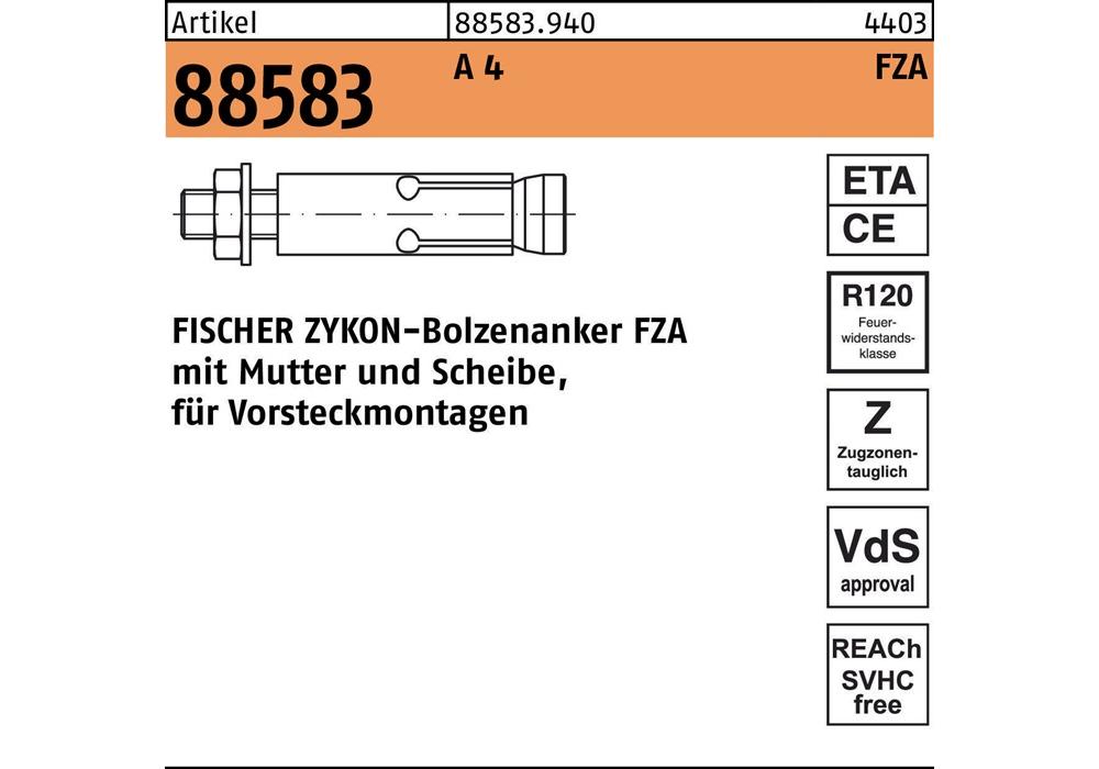 Artikel 88583 A 4 FZA FISCHER ZYKON-Bolzenanker FZA mit Mutter und Scheibe · für Vorsteckmontagen - Abmessung: 18x 80 M 12/25 VE=S (10 Stück)Weitere technische Eigenschaften: