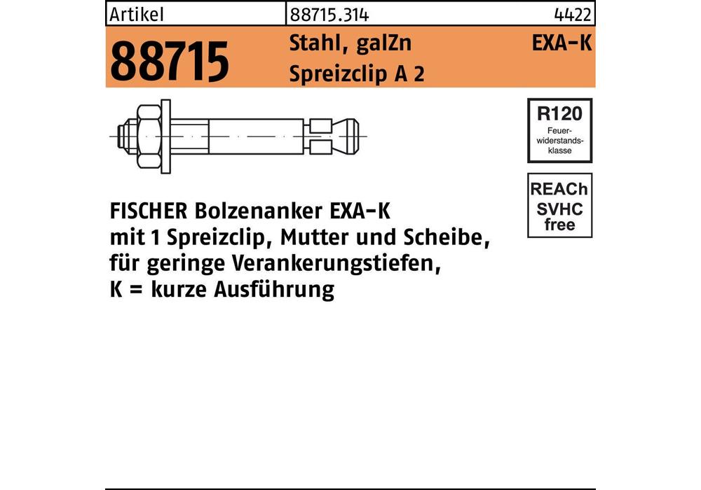 Artikel 88715 Stahl · galZn EXA-K Spreizclip A 2 FISCHER Bolzenanker EXA-K mit 1 Spreizclip · Mutter und Scheibe - Abmessung: EXA M 8 K VE=S (100 Stück)Weitere technische Eigenschaften:
