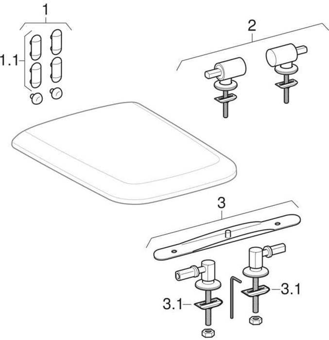 · Scharnierfussbefestigung am Sitz mit: in den Deckel gesteckte Stifte