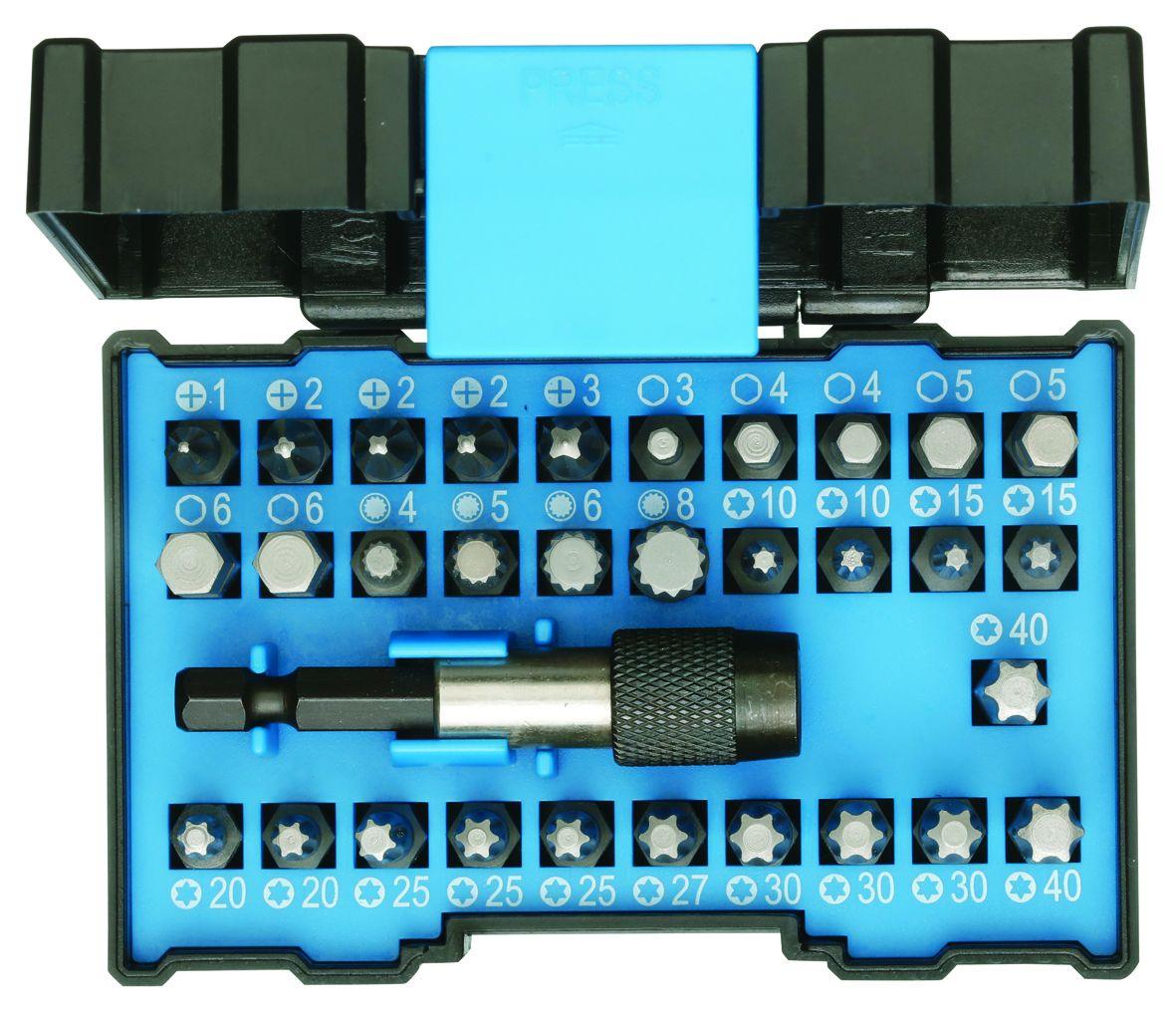 Stückliste (Text) | PH 1 (1x) PH 2 (3x) PH 3 (1x) TX T10 (2x) T15 (2x) T20 (2x) T25 (3x) T27 (1x) T30 (3x) T40 (2x) 3 (1x) 4 (2x) 5 (2x) 6 (2x) XZN M4 (1x) M5 (1x) M6 (1x) M8 (1x) Adapter 1/4"-1/4" Millimeter |