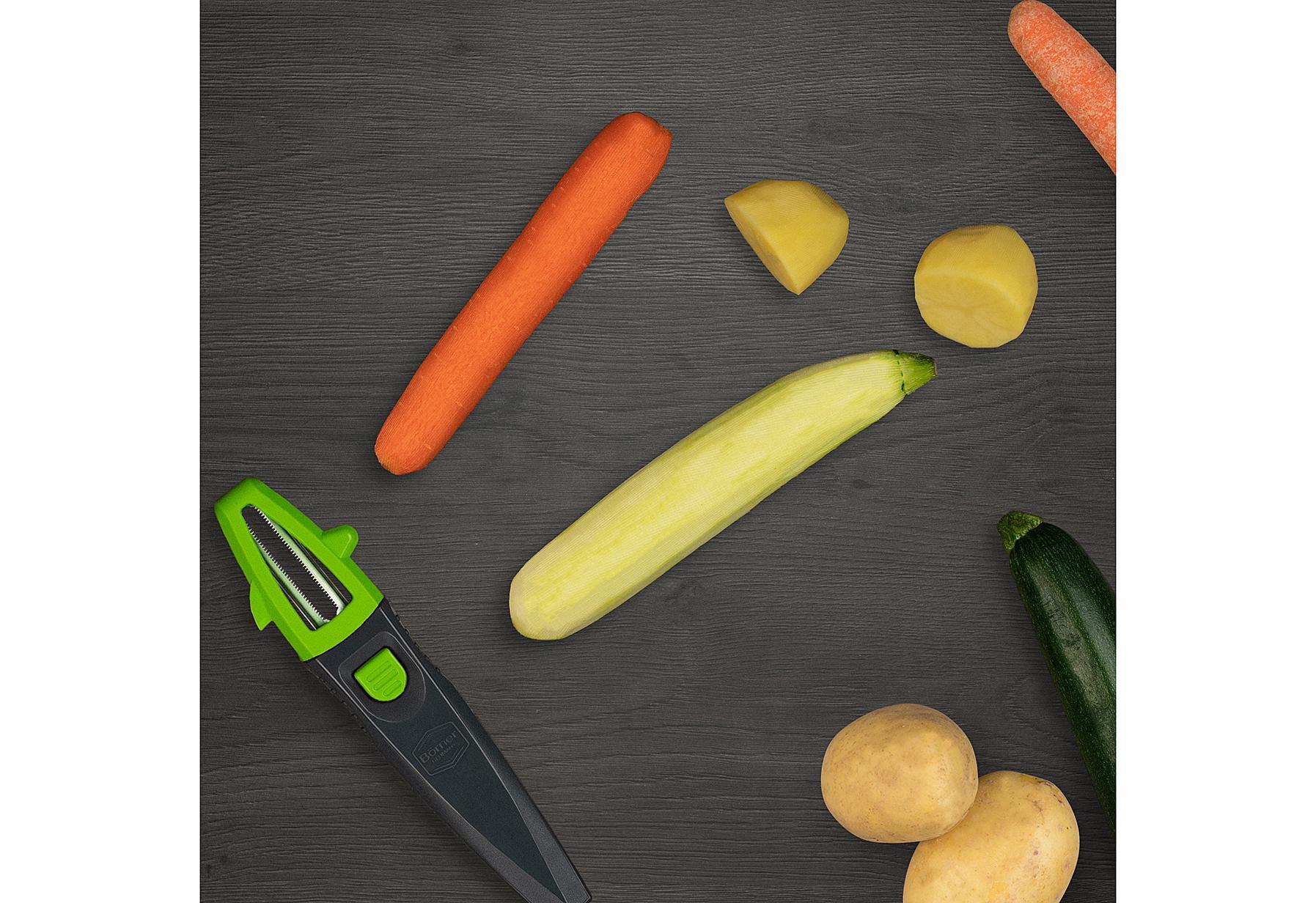 Börner Multi Peeler 3er Set. 3-in 1: Ein praktischer Multigriff mit 3 wechselbaren Schäleraufsetzen: Julienne Schneider, Kartoffelschäler, Y-Schäler. Mit dem Y-Schäler Aufsatz kann Gemüse in feine Streifen geschnitten werden, der Stabschäler Aufsatz kann Obst und Gemüse sehr dünn schälen, somit wird wenig verschwendet, zusätzlich verfügt er über eine Ausstechfunktion für z.B. Kartoffelaugen. Mit dem Julienneschäler Aufsatz können leckere Gemüsespaghettis aus Zucchini oder Möhren hergestellt werden, er ist auch als Zitrus- & Orangenöffner geeignet, da zusätzlich eine scharfe Spitze an der Seite vorhanden ist.Lieferumfang: