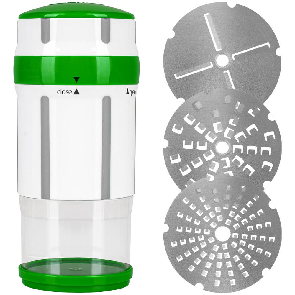 - einfachste Bedienung – einfach Lebensmittel einlegen, den Deckel befestigen, drehen und schon landet das Schneidgut direkt in dem Auffangbehälter oder über den gewünschten Speisen
