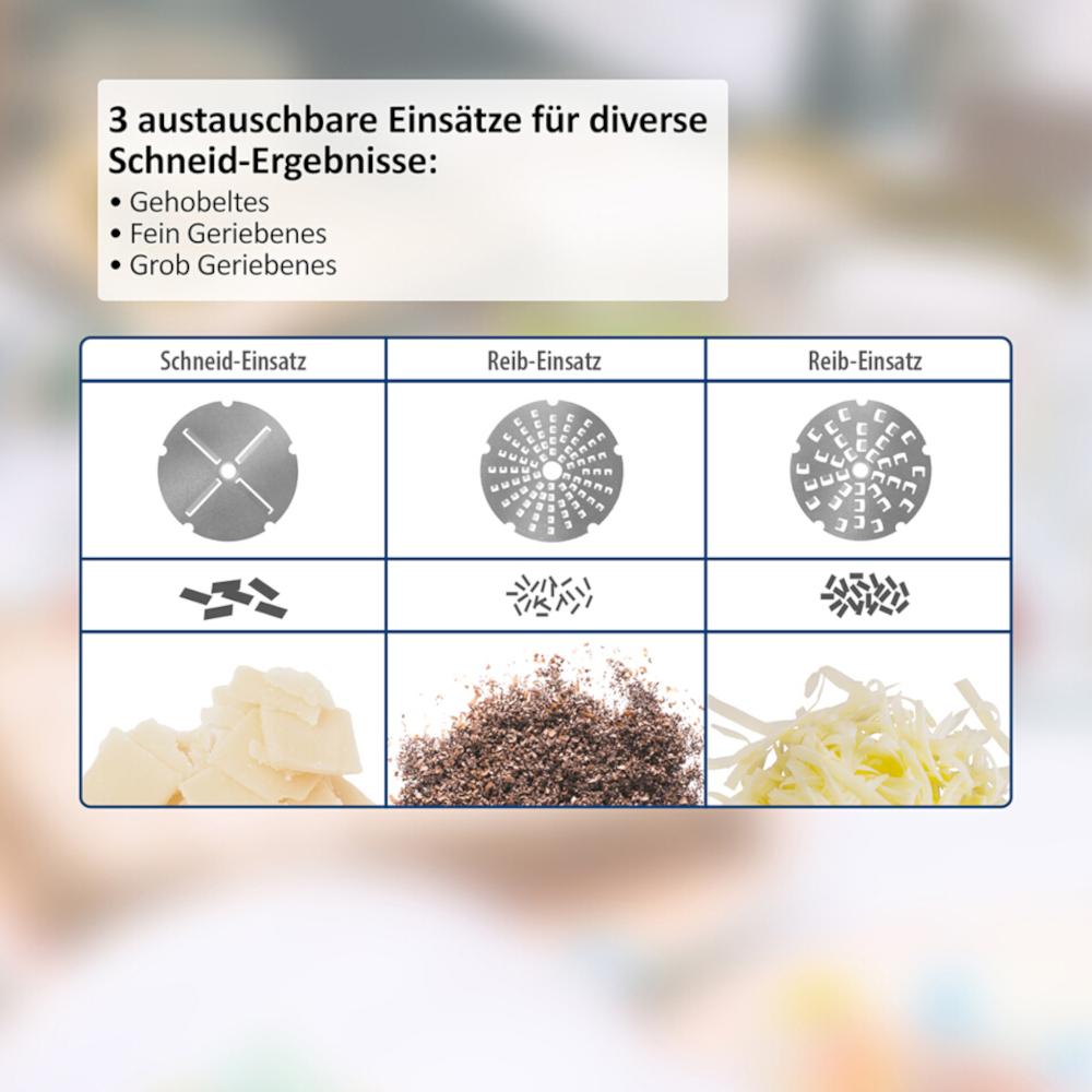 - vielseitig – 3 verschiedene Einsätze für feine & grobe Reib-Ergebnisse und Streifen