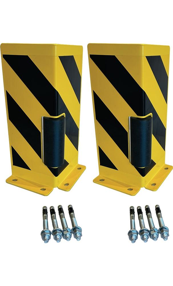 für Regalsysteme im Eck- und im Durchfahrtsbereich · aus gekantetem Stahlblech, Stärke 5 mm · Höhe 400 mm · pulverbeschichtet · verkehrsgelb, RAL 1023 mit Warnmarkierung tiefschwarz, RAL 9005 · inklusive Schwerlastanker zur Befestigung auf Betongrund · VE = 2 StückWeitere technische Eigenschaften: