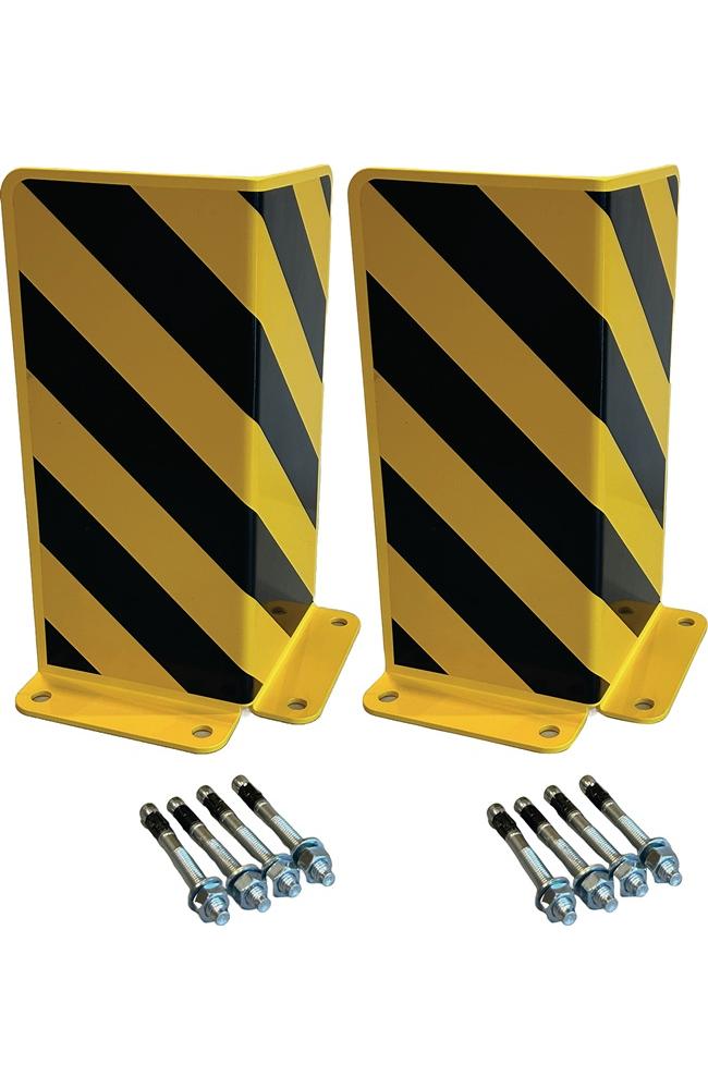 für Regalsysteme im Eck- und im Durchfahrtsbereich · aus gekantetem Stahlblech, Stärke 5 mm · Höhe 400 mm · pulverbeschichtet · verkehrsgelb, RAL 1023 mit Warnmarkierung tiefschwarz, RAL 9005 · inklusive Schwerlastanker zur Befestigung auf Betongrund · VE = 2 StückWeitere technische Eigenschaften: