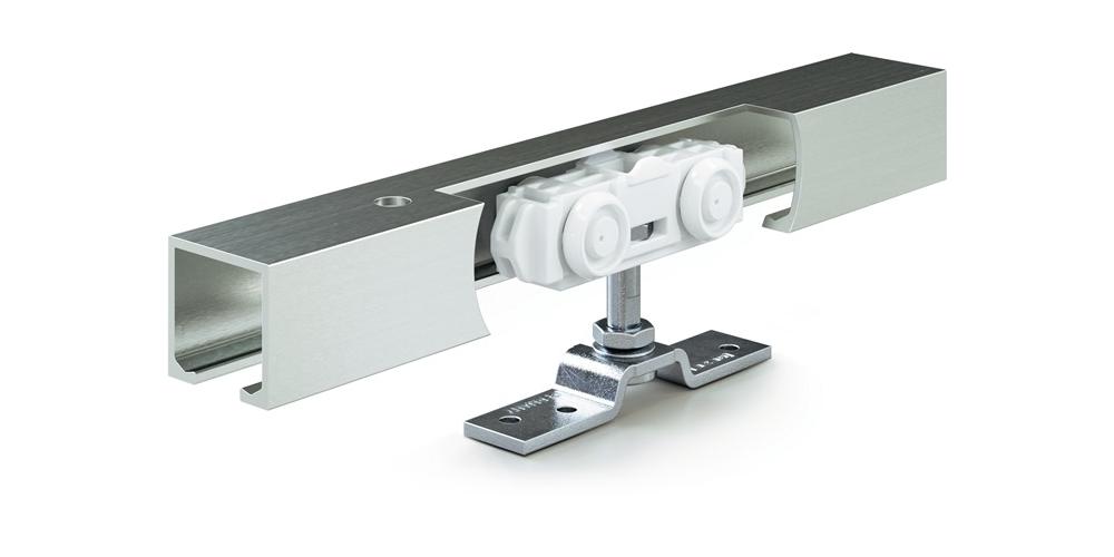 Komplett-Set für Holz-, Kunststoff- oder Metalltüren bis 40 kg · Wand- oder Deckenmontage · Set für 1 Tür bestehend aus Laufrohr jeweiliger Länge, Rollenwagen, Wandbefestigungswinkel, Trägerplatten, Puffer beidseitig, Bodenführung HolzWeitere technische Eigenschaften: