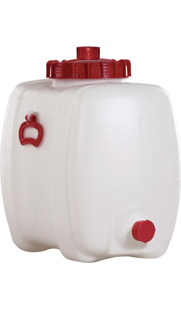 ovale Form · weiß · Schraubdeckel Ø 200 mm · Auslaufstutzen Ø 34 mm · Verschlusskappe mit Dichtung und Auslaufhahn · aus schlag- und stoßfestem Polyethylen · beständig gegen die meisten Säuren und Laugen (bitte anfragen) · lebensmittelecht · Füllstand von Außen gut sichtbar · temperaturbeständig von - 20 °C bis + 50 °C · Tragfähigkeit je Griff max. 30 kgWeitere technische Eigenschaften:
