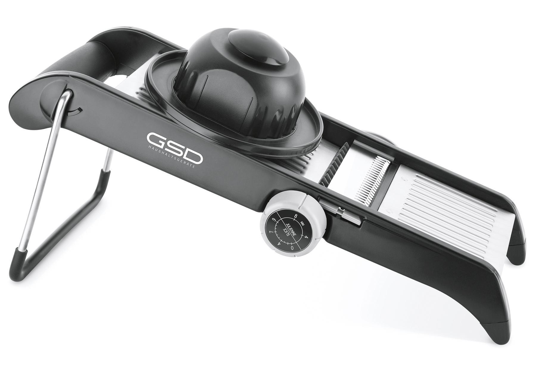 Profi Mandoline mit verschiedene Schnittarten von Gemüse – Scheiben, Stifte, Streifen, Wellen, Waffeln – dank integrierter Schneideinsätze, lassen sich einfach und sicher mit der hochwertigen GSD Profi Mandoline zubereiten. Rutschfeste Gummifüße und ergonomischer Restehalter mit Fingerschutz sorgen für eine sichere Verwendung. Hochwertige Mandoline mit Edelstahl-Schneidflächen und stabilem Kunststoffrahmen. Rostfreies hochwertiges Edelstahlmesser mit scharf geschliffener Klinge. Integrierte Schneideinsätze: für Scheiben von 1 mm bis 9 mm, für Julienne (4 mm) und für Stifte / Streifen (8 mm), für Wellen- und Waffel-Muster. Spülmaschinengeeignet.Attribute