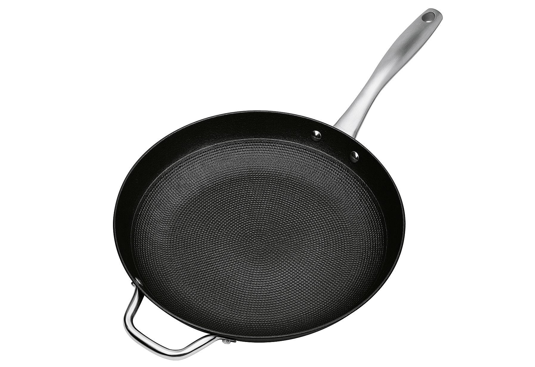 Die Bratpfannen sind besonders für die Profi- Küche geeignet - Ideal für Krossgebratenes. Innen ist eine neuartige PFAS-freie VITAFLON®QUARZIT Antihaft-Versiegelung mit hochwertigem, brillantem Finish. Es ist eine ausgezeichnete Antihaftwirkung, extrem hart und kratzfest. Der Boden ist eingearbeiteter Waben zur besseren Öl-, Fettverteilung mit einer optimierten, schnellen Hitzeverteilung. Die Edelstahlgriffe sind robust und hartgenietet. Diese Bratpfannen sind für alle Herdarten, auch Induktion geeignet. Backofengeeignet bis 240°C. Material: Gusseisen / Glas. Maße: Ø 24 cm, H 4,5 cm.