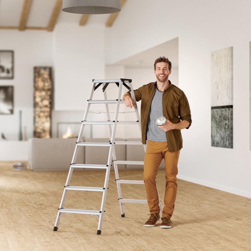 - die Alu-Sicherheits-Doppelstufenleiter mit den zwei Aufstiegsmöglichkeiten
