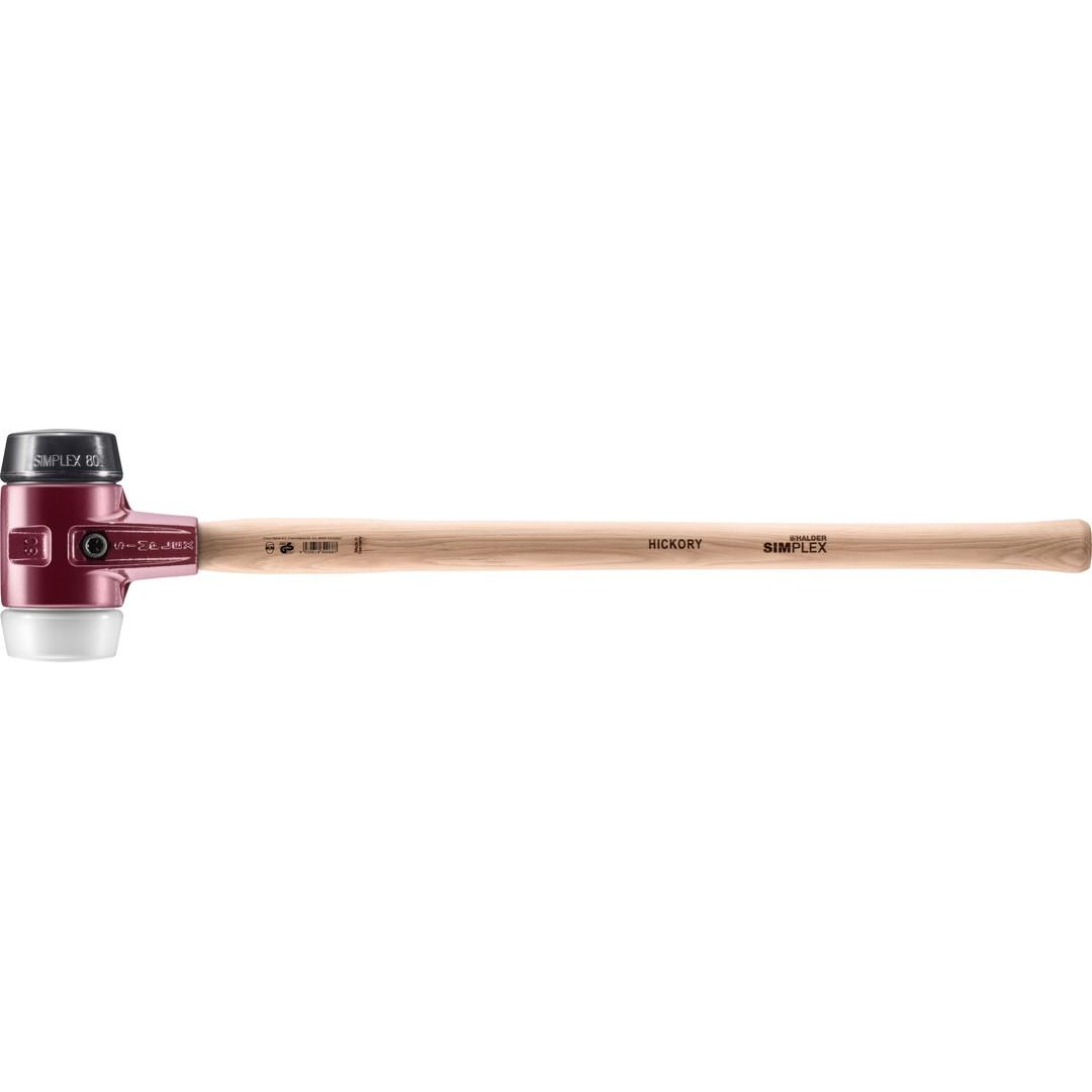 - SIMPLEX-Vorschlaghammer in der Einsatzkombination Gummikomposition (schwarz, mittelhart, dämpfend, geruchsneutral, verschleißarm) / Superplastik (weiß, mittelhart, sehr widerstandsfähig).
