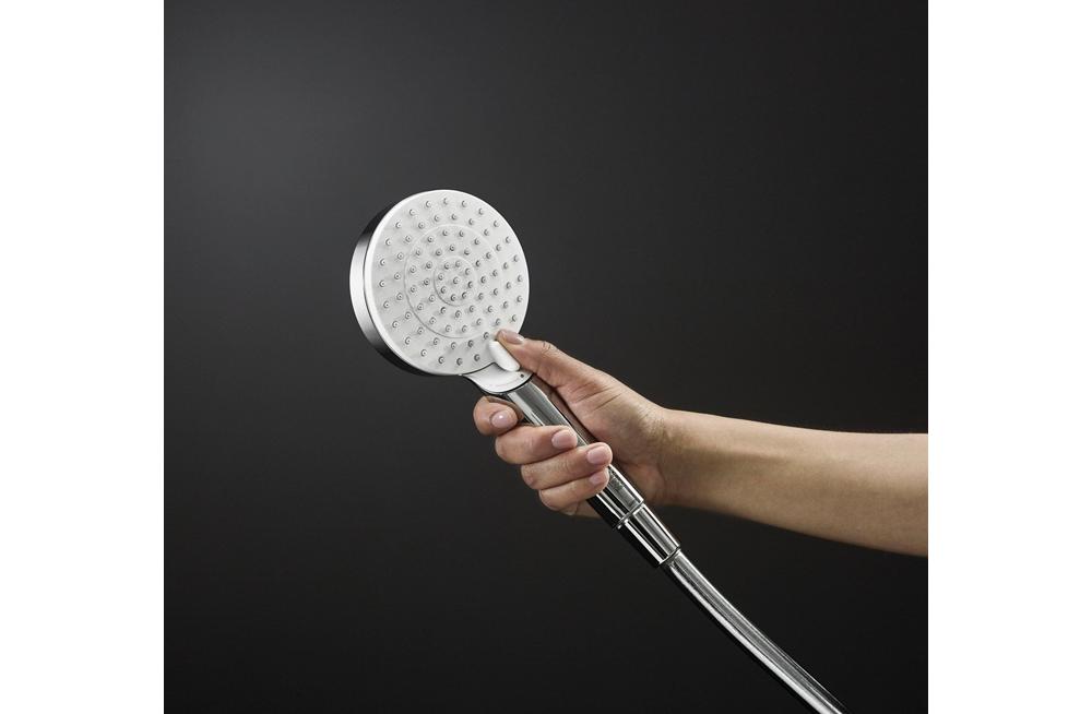 besteht aus: Handbrause · Brausestange · Brauseschlauch · Handbrausehalterung Brausekopfgröße: 100 mm Strahlart: Rain · IntenseRain Strahlartenumstellung durch drehbare Strahlscheibe QuickClean: Kalkablagerungen lassen sich einfach mit dem Finger abrubbeln um 45Grad verstellbarer Neigungswinkel der Handbrausehalterung maximale Durchflussmenge bei 3 bar: 13,8 l/min Mindestfließdruck: 1 bar Wandstützen aus Kunststoff Profil Brausestange: rund Gesamtlänge Brausestange: 669 mm Brausestangendurchmesser: 22 mm Bohrabstand: 625 mm brauseseitiger Drehwirbel gegen lästiges Verdrehen des BrauseschlauchesWeitere technische Eigenschaften: