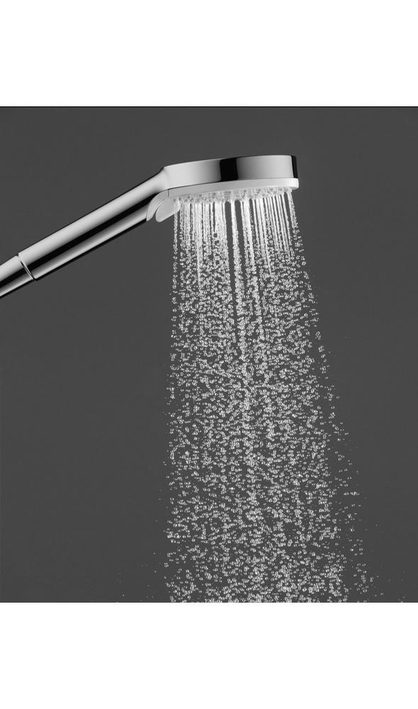 besteht aus: Handbrause · Brausestange · Brauseschlauch · Handbrausehalterung Brausekopfgröße: 100 mm Strahlart: Rain · IntenseRain Strahlartenumstellung durch drehbare Strahlscheibe QuickClean: Kalkablagerungen lassen sich einfach mit dem Finger abrubbeln um 45Grad verstellbarer Neigungswinkel der Handbrausehalterung maximale Durchflussmenge bei 3 bar: 13,8 l/min Mindestfließdruck: 1 bar Wandstützen aus Kunststoff Profil Brausestange: rund Gesamtlänge Brausestange: 959 mm Brausestangendurchmesser: 22 mm Bohrabstand: 915 mm brauseseitiger Drehwirbel gegen lästiges Verdrehen des Brauseschlauches