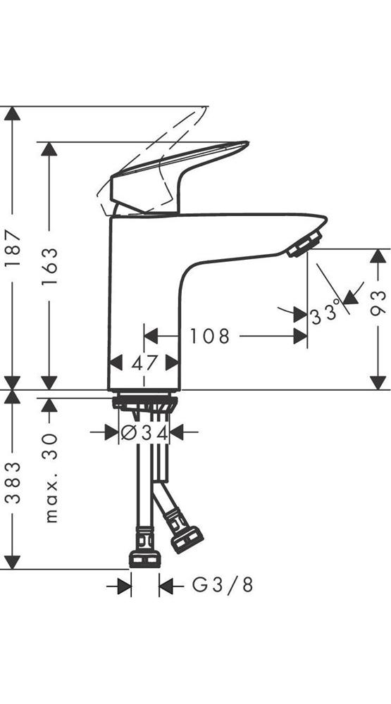 ComfortZone: 100 Ausladung: 108 mm Auslaufhöhe: 93 mm Griffvariante: Hebelgriff Strahlart: Normalstrahl maximale Durchflussmenge bei 3 bar: 5 l/min Keramikmischsystem Temperaturbegrenzung einstellbar für Durchlauferhitzer geeignet Anschlussart: G 3/8 Anschlussschläuche Anschlussgröße: DN15 EU-Taxonomie: max. 6 l/min - wesentlicher Beitrag (SC) möglichWeitere technische Eigenschaften: