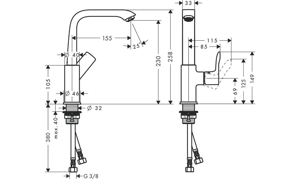 ComfortZone: 230 Ausladung: 155 mm Auslaufhöhe: 230 mm Griffvariante: Hebelgriff Schwenkbereich 120Grad Strahlart: Normalstrahl maximale Durchflussmenge bei 3 bar: 5 l/min Keramikmischsystem Temperaturbegrenzung einstellbar für Durchlauferhitzer geeignet Anschlussart: G 3/8 Anschlussschläuche Anschlussgröße: DN15 Seitliche Griffposition: unten am Grundkörper (nicht für Waschschüsseln geeignet) EU-Taxonomie: max. 6 l/min - wesentlicher Beitrag (SC) möglichWeitere technische Eigenschaften: