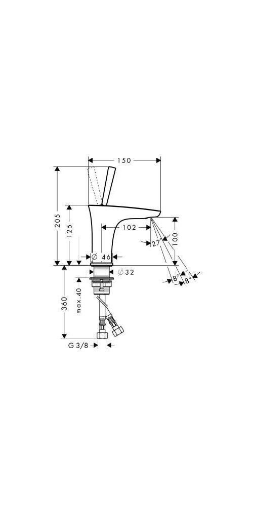 mit Push-Open Ablaufgarnitur 1 1/4″ · ComfortZone 100 · Ausladung 102 mm · Laminarstrahl · Durchflussmenge 5 l/min · einstellbarer Strahlformer · Joystick-Keramikmischsystem · Anschlussschläuche G 3/8″