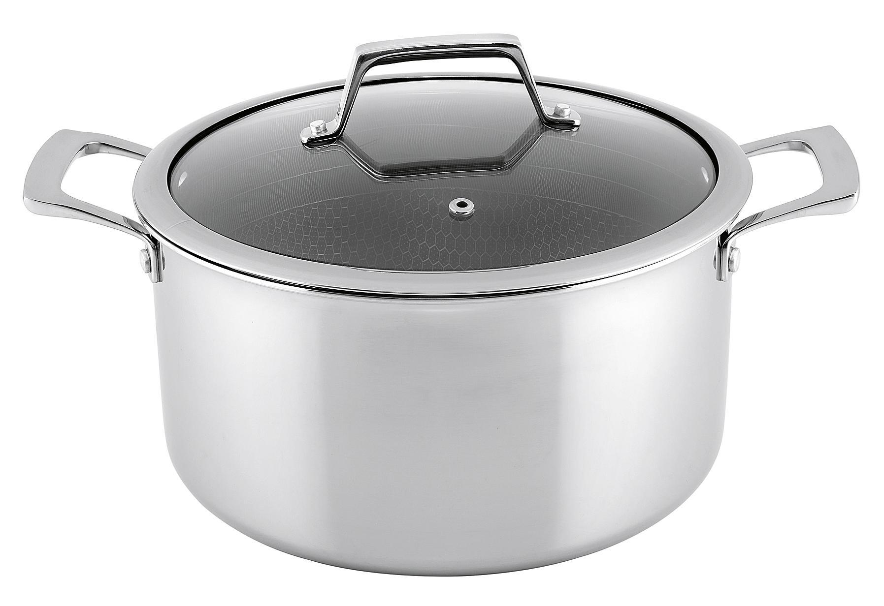 HAWS Santo Kochtopf Ø 28 cm, 5,8 l mit Deckel. Die fortschrittliche Mehrschichttechnologie, ein 3-lagiges Design aus rostfreiem Stahl, Aluminium und rostfreiem Stahl mit einer starken Hybridbeschichtung, sorgt für eine optimale Wärmeverteilung im Topf. Die Beschichtung ermöglicht die Verwendung von Metallutensilien, ohne dass eine Beschädigung der Beschichtung oder der Utensilien selbst zu befürchten ist, und ist zudem PFAS-frei. Backofenfest bis zu 260 Grad (ohne Deckel).