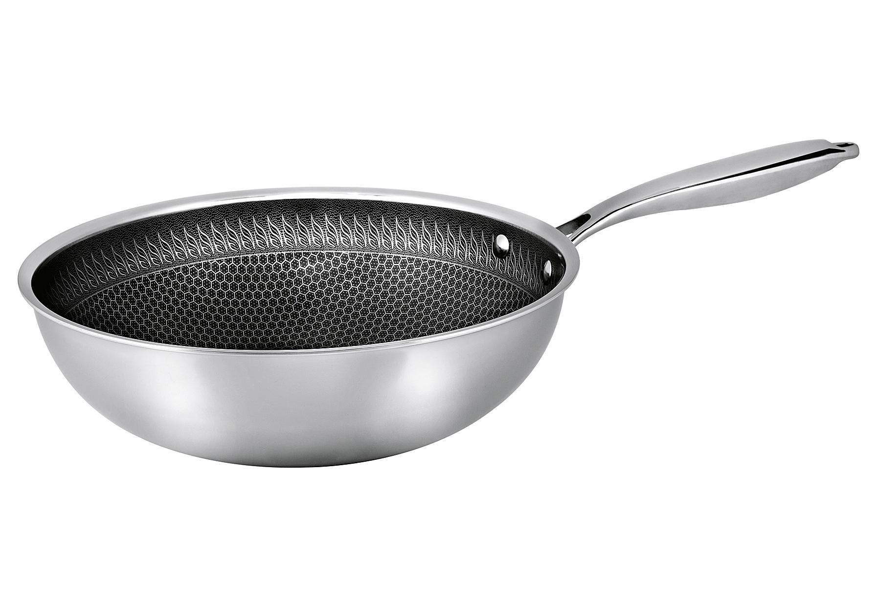 Hâws Wok "Santo" 28 cm Hybrid coating - Die fortschrittliche Mehrschichttechnologie, ein 3-lagiges Design aus rostfreiem Stahl, Aluminium und rostfreiem Stahl mit einer starken Hybridbeschichtung, sorgt für eine optimale Wärmeverteilung im Topf. Die Beschichtung ermöglicht die Verwendung von Metallutensilien, ohne dass eine Beschädigung der Beschichtung oder der Utensilien selbst zu befürchten ist, und ist zudem PFAS-frei. Backofenfest bis zu 260 Grad ohne DeckelAttribute