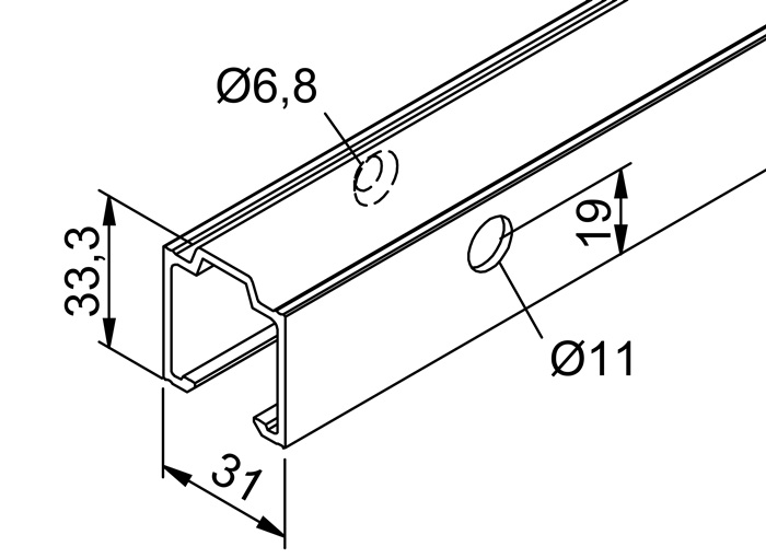 HELM Laufschiene, aus Serie MK-L 80 · bis 80 kg Flügelgewicht · für Deckenmontage zur Aufnahme der Wandwinkel gebohrt oder für Wandmontage seitlich gebohrt · Material Aluminium · für Holz- und GlasschiebetürenWeitere technische Eigenschaften: