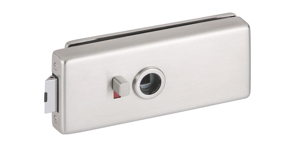 Doppelklemmnuss · verschraubte Schlossabdeckung aus Edelstahl · Flüsterfalle, geräuschgedämpfte Ausführung · Zubehörbeutel mit Drückerführung 16 + 18 mm inkl. Abdeckungen in Schlossfarbe · Badtürschloss: mit Schiebe-Riegel · rot / weiß-Anzeige · Entriegelung auch bei gedrücktem Drücker möglich · für 8 mm Glasstärkegeprüft gem. EN 12209:2003/AC:2005 Klassifizierung: 3/M/5/0/0/F/1/E/C/1/0