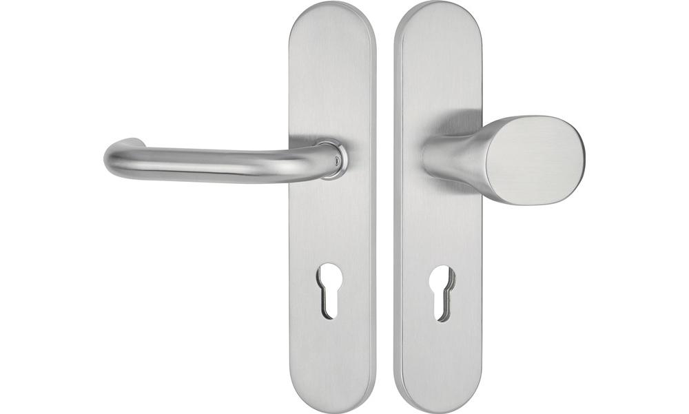 ZT-EN2 Wechselgarnitur mit Langschild 2089 S, Knopf 3128 gekröpft · Außenschild bestehend aus Stahl Unterkonstruktion mit gehärteter Außenplatte und Edelstahl Dekor-Abdeckschild, unsichtbar verschraubt · gehärtete Stahlnocken zur Aufnahme der Gewindeschrauben · 3-fach M6 Verschraubung mit Stahlschrauben und Gewindestopp · Knopf links / rechts verstellbar mit integrierter Verdrehsicherung · Innenschild mit Stahl-Unterkonstruktion und Edelstahl Dekor-Clipschild unsichtbar verschraubt · Drücker fest gelagert · Ausführung PZ gelocht · geprüft nach DIN 18257 – ES 1 · Aussenschild 12 mm stark