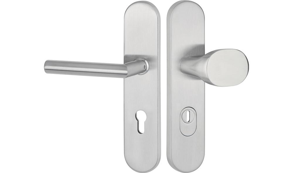 ZT-EN2 Wechselgarnitur mit Langschild 2089 KS, Knopf 3128 gekröpft · Außenschild bestehend aus Stahl Unterkonstruktion mit gehärteter Außenplatte und Edelstahl Dekor-Abdeckschild, unsichtbar verschraubt · gehärtete Stahlnocken zur Aufnahme der Gewindeschrauben · 3-fach M6 Verschraubung mit Stahlschrauben und Gewindestopp · Knopf links / rechts verstellbar mit integrierter Verdrehsicherung · Innenschild mit Stahl-Unterkonstruktion und Edelstahl Dekor-Clipschild unsichtbar verschraubt · Drücker fest gelagert Ÿ Ausführung KS: Kernziehschutz federnd gelagert, dadurch stufenlose, automatische Anpassung an die Profilzylinderlänge · geprüft nach DIN 18257 – ES 1 · Zylinderüberstand 8-15 mm