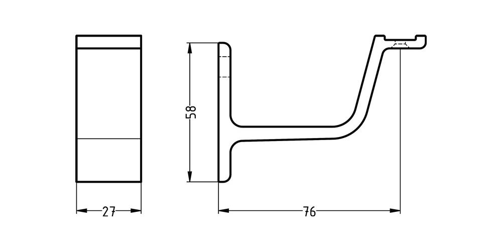 nach DIN 18040 · gerade Auflage · Aluminiumprofil · Wandabstand 76 mm · Wandplatte Höhe 58 mm, Breite 27 mm · mit sichtbarer Bohrung für Schraube M8 · ohne Befestigungsmaterial · C2C-zertifiziertWeitere technische Eigenschaften: