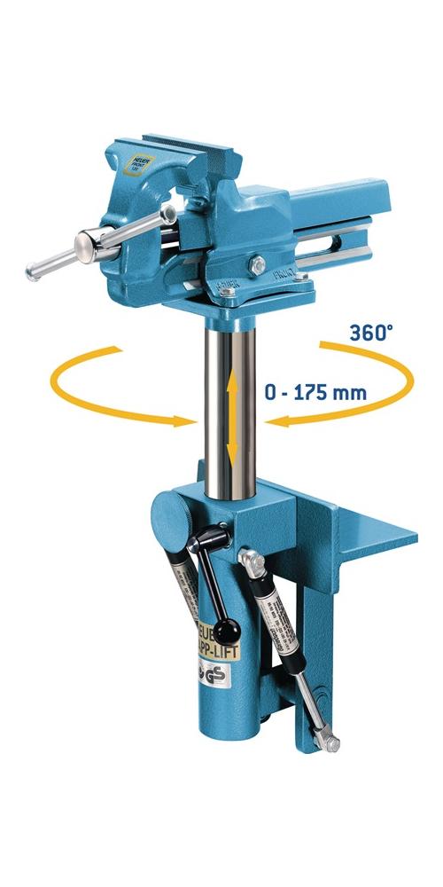 mit Gasdruckfedern und Sicherheitsspannhebel · ermöglicht stufenlose Höhenverstellung des Schraubstocks um 175 mm und Drehung um 360° · bei Nicht-Gebrauch kann der Schraubstock einfach unter die Werkbank geklappt werden, somit steht die gesamte Arbeitsfläche für andere Tätigkeiten zur Verfügung · Made in Germany · Lieferung ohne SchraubstockWeitere technische Eigenschaften: