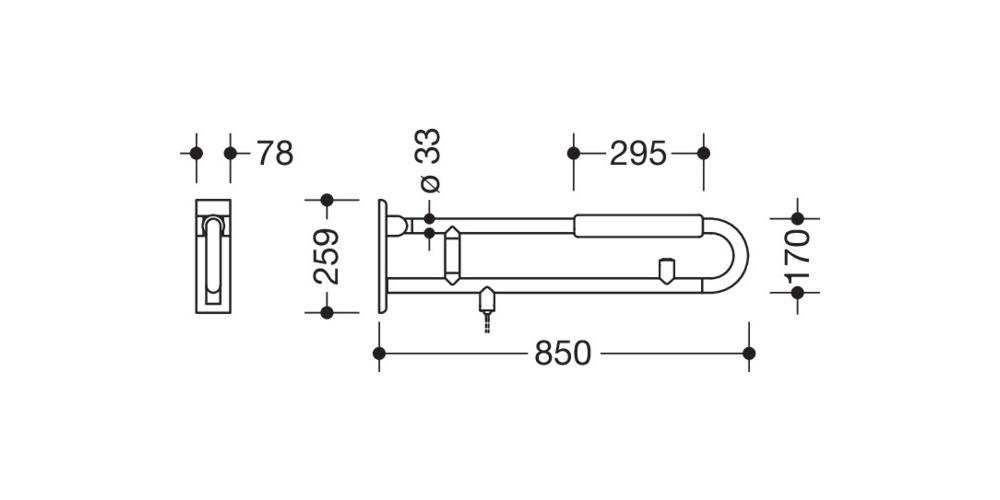 HEWI Stützklappgriff E-Ausführung Serie 801 Spültaste, mit Armpolster 850 mm lichtgrau