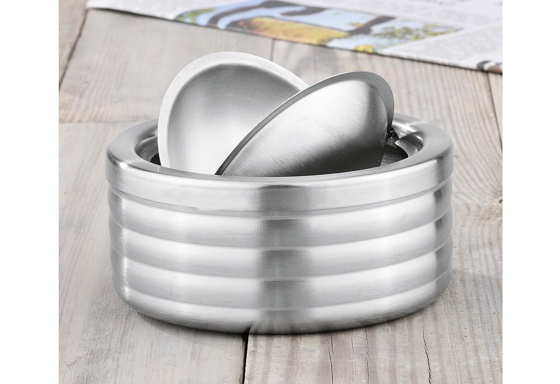 Aschenbecher aus Edelstahl mit einem Durchmesser von 12 cm und einer Höhe von 5,5 cm.Attribute