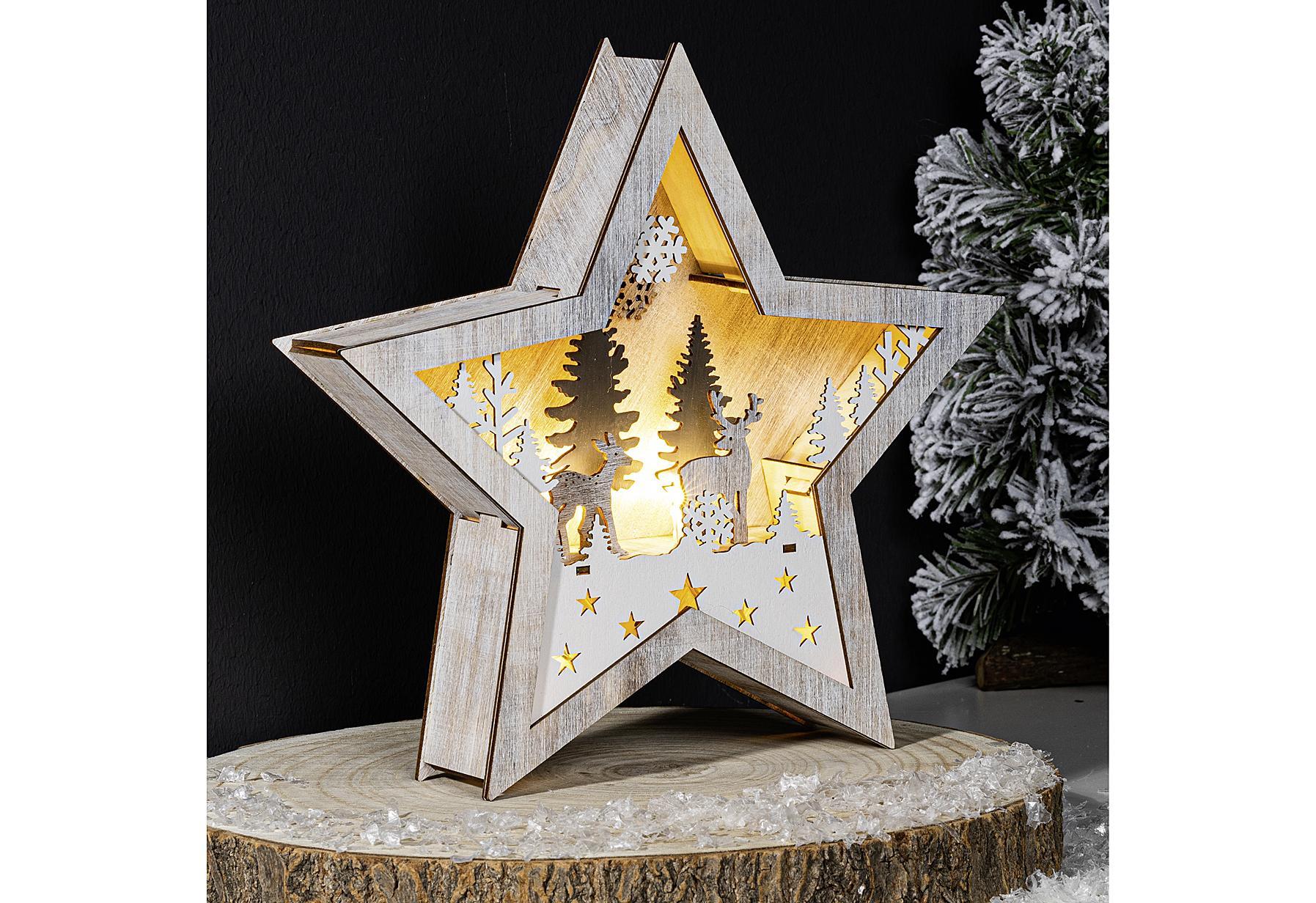 HI LED Holzstern batteriebetrieben, benötigt werden 2xAA, nicht im Lieferumfang enthalten. Material: Holz. Maße: (LxBxH): 25,5x5x25,5 cm.Attribute