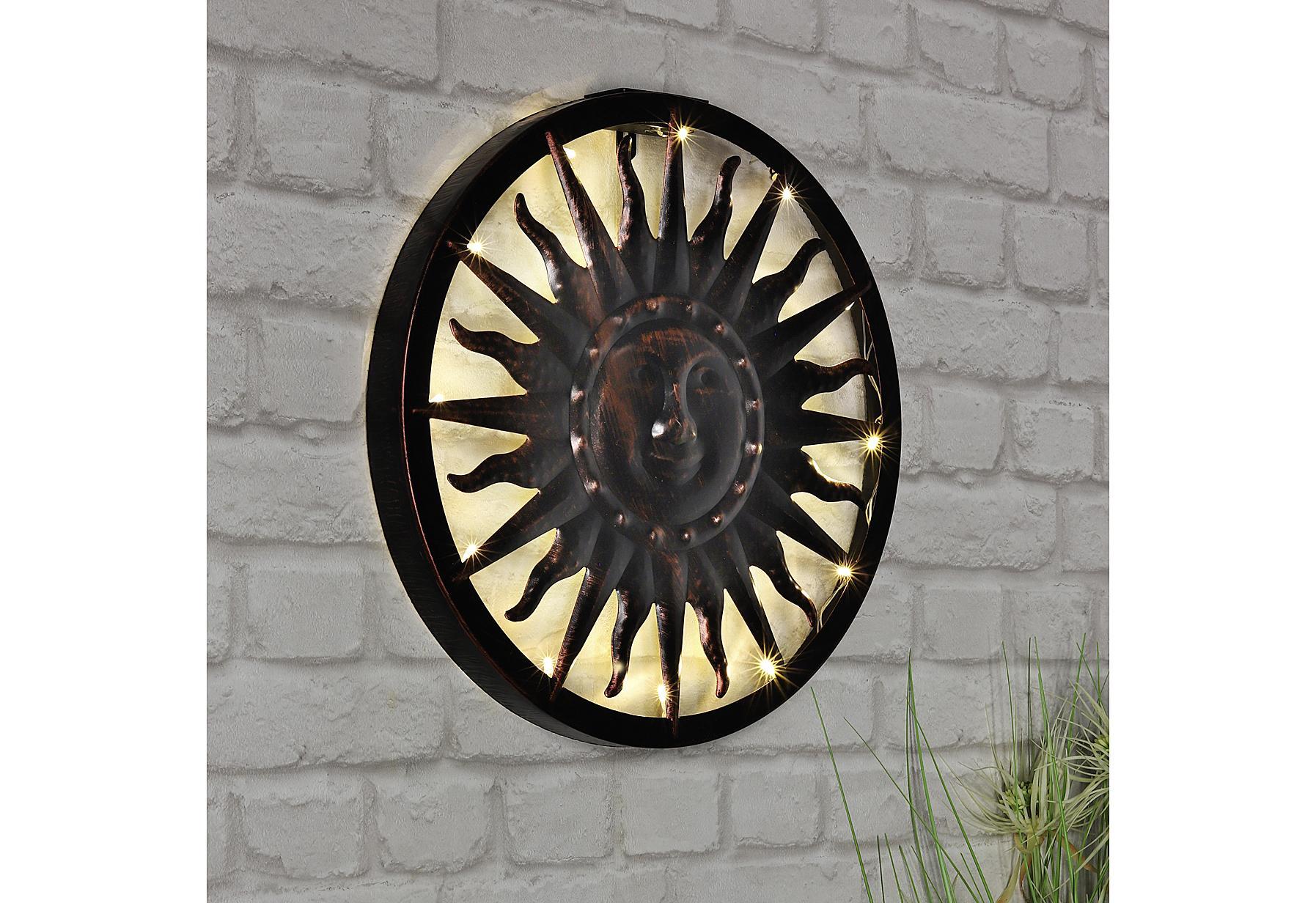 LED Solar-Wandlicht „Sonne“. Der Rahmen ist aus Metall, mit 12 warm-weißen LED. Maße: ca. (LxBxH): 40x40x4 cm.Lieferumfang: