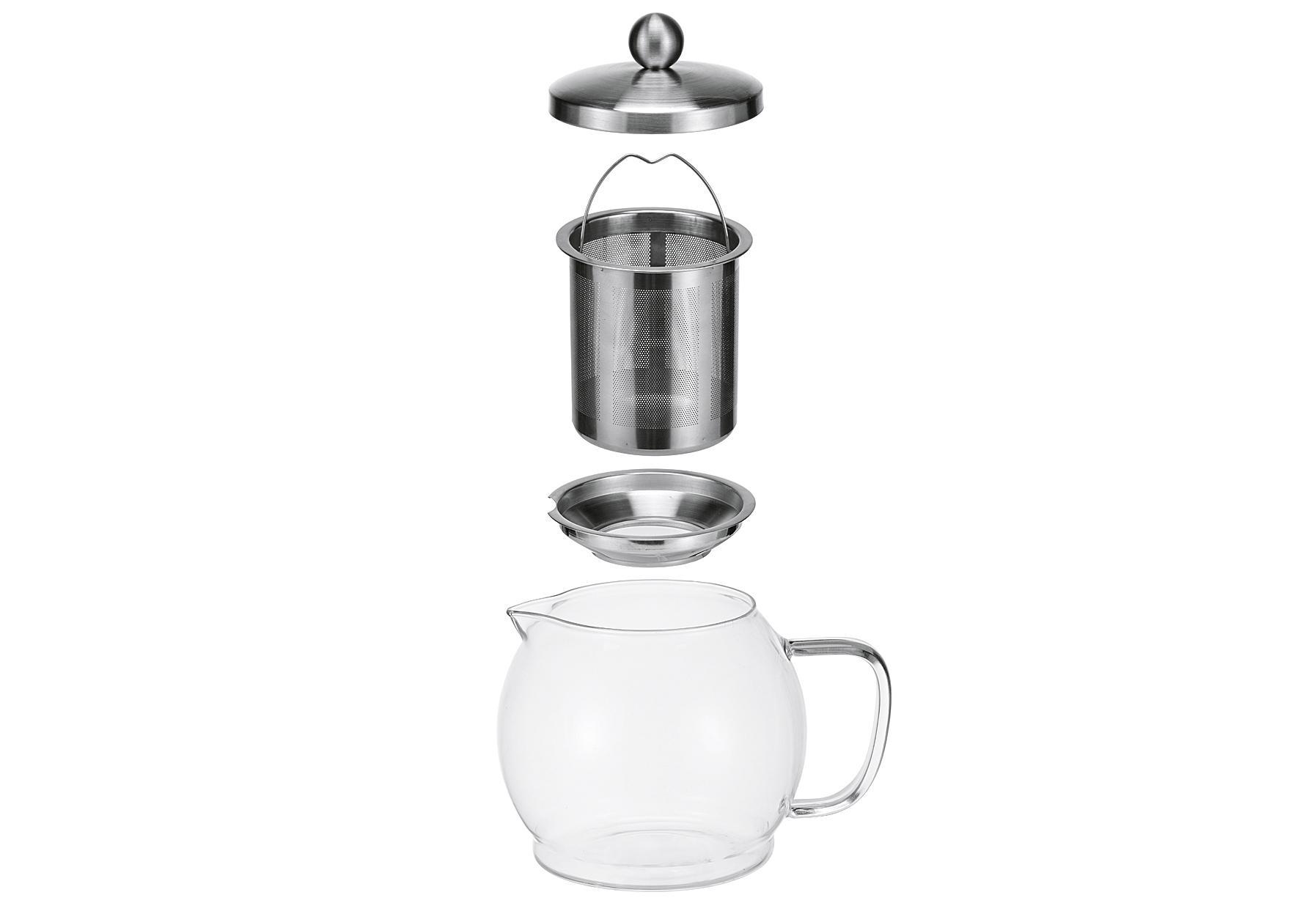 Teekanne aus Glas, mit Edelstahlfilter und Deckel. Kapazität ca. 1,2 Liter. Der Filter ist herausnehmbar. Material: Edelstahl / Glas. Maße: (LxBxH): 17x14,5x14 cm.Attribute