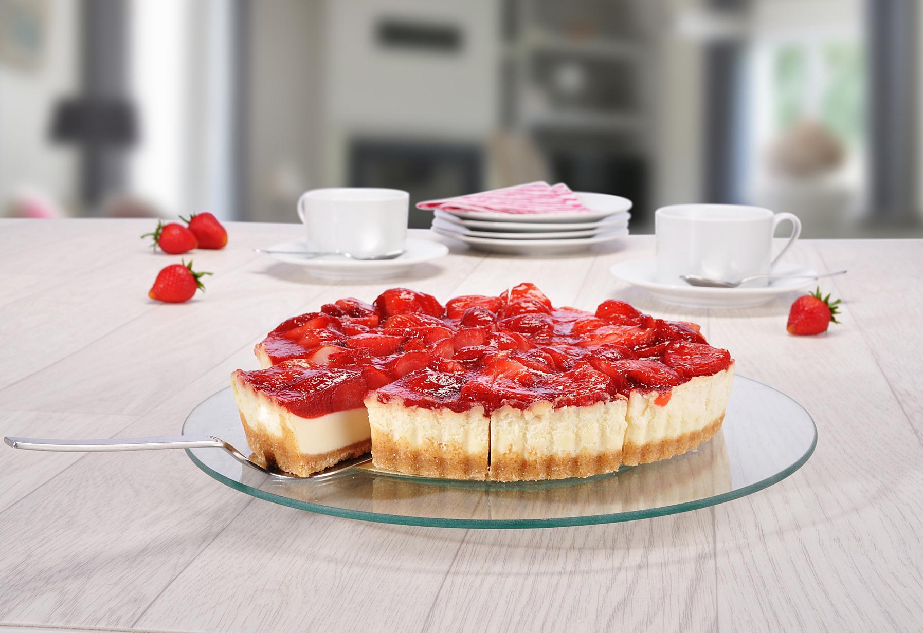 Drehbare Kuchenservierplatte, bestens geeignet jeden Kuchen oder jede Torte in Szene zu setzen. Maße: Ø 30, H 2,25 cm / Bodendurchmesser: ca. Ø 15 cm. Material: Glas / Edelstahl.Attribute