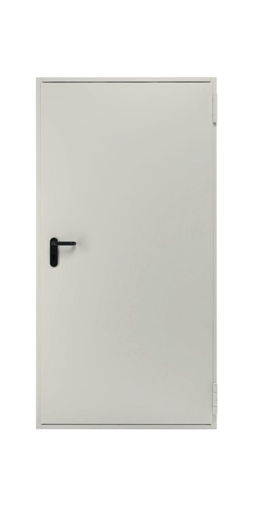 1-flüglig · H8-5 Dünnfalz - Stahl · Stahl-Feuerschutzelement mit Brandschutzeigenschaften, klassifiziert nach T30 · Aussteifung mit Flachstahl · Türblattdicke 45 mm · Türblatt DIN linksund DIN rechts verwendbar · Blechdicke 0,9 mm · Türblattfalz im Standard 2‑seitig · Dämmung mit Mineralfaserplatte · Oberfläche von Türblatt und Zarge verzinkt, grundiert Grauweiß, ähnlich RAL 9002 · Ergänzungszarge im Standard verzinkt, Grundierung gegen Mehrpreis, Drückergarnitur Kurzschild, Kunststoff schwarz, Dichtung