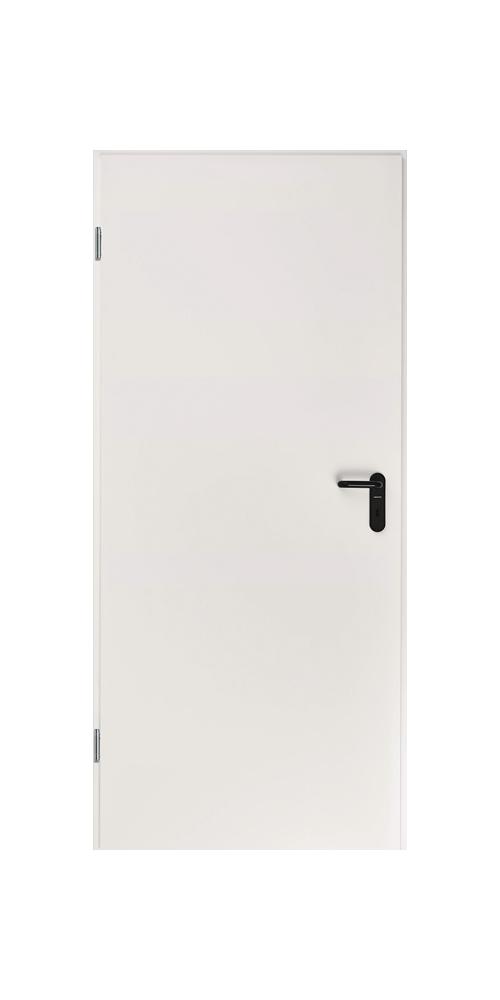 Türblatt 3-seitig gefälzt (Dickfalz), 40 mm dick · Blechdicke 0,8 mm · mit Styroporeinlage · Einsteckschloss mit Stahlfalle · vorgerichtet für Kurzschild · U-Profil im unteren Bereich · mit Bändern der Serie V0026 WF, verzinkt · 1 x Sicherungsbolzen (799 mm ab Türkasten) · Eckzarge B1 · mit Bändern V1000-01 WF, verzinkt · ohne Bodeneinstand · mit Durchschraubmontage durch den Nutgrund (inklusive Dübelanker) · inklusive Dichtung · Drückergarnitur Kunststoff schwarz · Element verpackt in SchrumpffolieWeitere technische Eigenschaften: