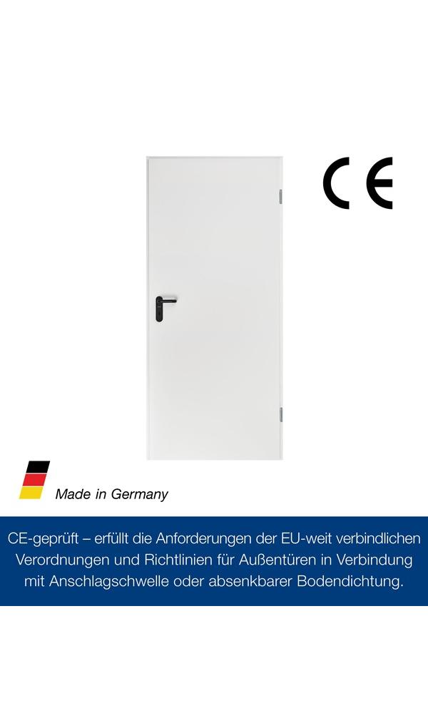 Türblatt 3-seitig gefälzt (Dickfalz), 40 mm dick · Blechdicke 0,8 mm · mit Styroporeinlage · Einsteckschloss mit Stahlfalle · vorgerichtet für Kurzschild · U-Profil im unteren Bereich · mit Bändern der Serie V0026 WF, verzinkt · 1 x Sicherungsbolzen (799 mm ab Türkasten) · Eckzarge B1 · mit Bändern V1000-01 WF, verzinkt · ohne Bodeneinstand · mit Durchschraubmontage durch den Nutgrund (inklusive Dübelanker) · inklusive Dichtung · Drückergarnitur Kunststoff schwarz · Element verpackt in Schrumpffolie