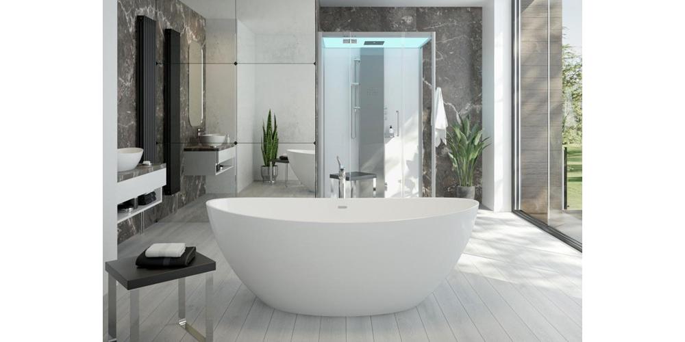 Badewanne Namur freistehend aus dem Material Solique. Überlaufgarnitur mit Schlitzüberlauf (Klick/Klack in Chrom) und Untergestell vormontiert · inklusive Anschlussschlauch zur Verbindung an HAT·Hausanschluss Solique ist ein Verbundmaterial aus vor allem Dolomit · Harz sowie Härter. Die Oberfläche besteht aus widerstandsfähigem Gelcoat.Weitere technische Eigenschaften: