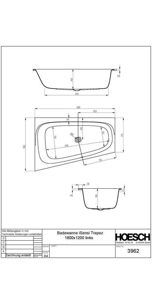 HOESCH Trapez-Badewanne iSensi 1800 x 1200 x 450 mm, links weiß
