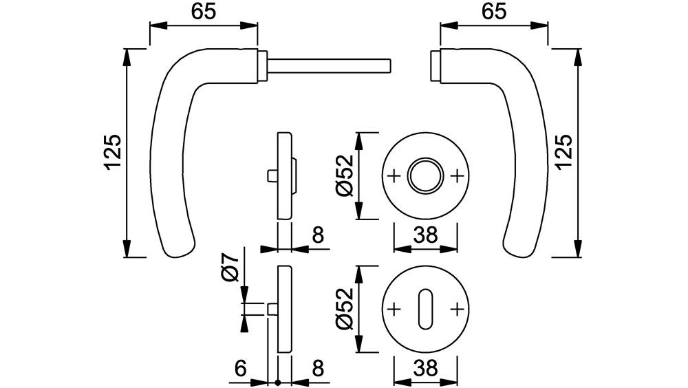 Innentür-Rosetten-Garnitur · geprüft nach DIN EN 1906 (Gebrauchs-Kategorie Klasse 3) · Türgriff mit Schnellstift-Verbindung · Rosetten mit Kunststoff-Unterkonstruktion · Rückholfeder und Stütznocken · Befestigung: verdeckt, durchgehend, wechselseitig, Mehrzweckschrauben · Vierkant 8 mm · Anschlagrichtung DIN links / rechts