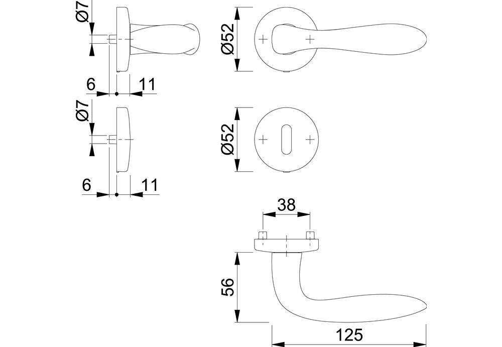 Innentür-Rosetten-Garnitur: geprüft nach DIN EN 1906 (Gebrauchs-Kategorie 3) · Türgriffe mit 8 mm Schnellstift-Verbindung (mit Vollstift) · Griff- und Schlüsselrosetten (Ø 53 mm) mit Kunststoff-Unterkonstruktion · Rückholfeder und Stütznocken · verdeckte, durchgehende Verschraubung mit selbstschneidenden Gewindeschrauben · DIN links / rechtsWeitere technische Eigenschaften: