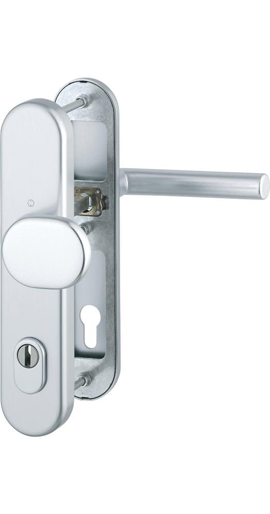 für Abschlusstüren · einbruchhemmend nach DIN 18257 · Stahl-Unterkonstruktion im Außen- und Innenschild · mit Rückholfeder-Paket · mit Zylinderabdeckung aus gehärtetem Stahl für vorstehende Zylinderlänge 10-18 mm · innen: loser Türgriff, mit Schnellstift-Verbindung · hochfeste, verdeckte Verschraubung · Knopfschild-Randhöhe: 15 mm · PZ · DIN links / rechts · einschließlich Befestigungsmaterial · Widerstandsklasse ES 1Weitere technische Eigenschaften: