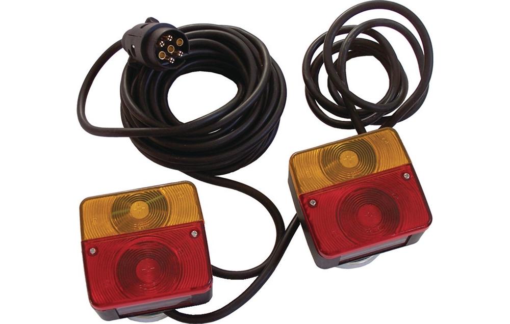 Anschlusskabel 7,5 m, Kabellänge zwischen den Leuchten 2,5 m, mit 7-poligem Stecker, 2 x 3-Kammern Anhängerleuchten mit Kennzeichenleuchte · mit Leuchtmittel 1 x 21W, 1 x 21/5W · Befestigung mittels Magneten · SB verpacktAttribute