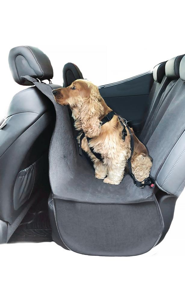 schützt die Rückbank vor Schmutz, Tierhaaren und Beschädigungen · überspannt den gesamt Rückbankbereich und auch den Fußraum · verhindert auch, dass der Hund nach vorn springt · mit Sicherheitsgurtöffnung · schmutz- und wasserabweisendes Gewebe, waschbar · schnelle Montage mit Schlaufen an den Kopfstützen der Vorder- und Rücksitze · anthrazit · SB VerpackungAttribute