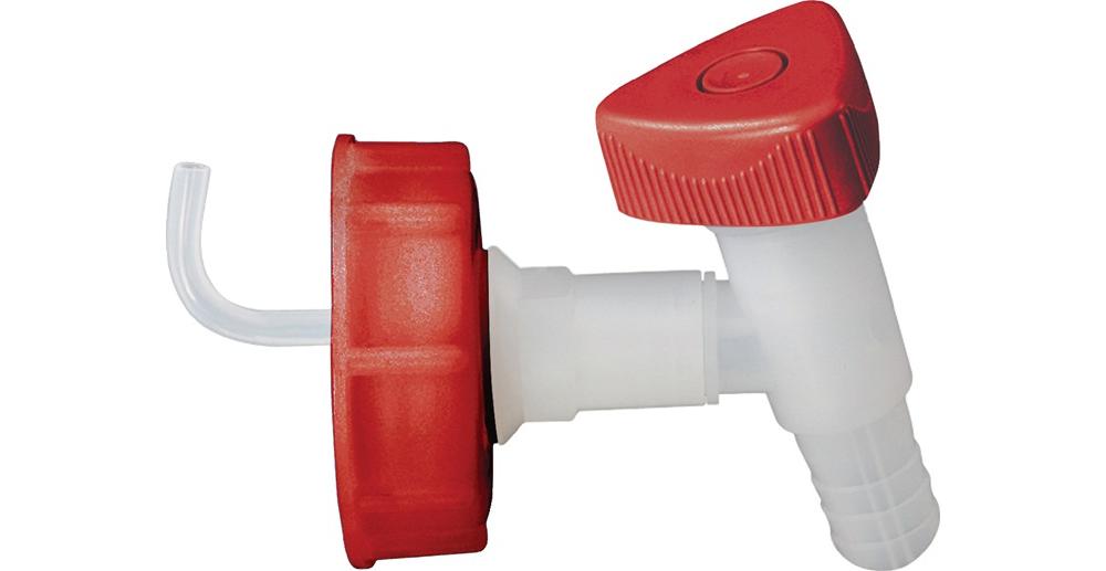 natur mit Drehgriff · für Kanister mit Verschraubung DIN 45 · Tüllenanschluss Außen-Ø 19 mm, Innen-Ø 15 mm · säure- und chemikalienbeständig · druckbeständig bis 0,4 bar · lebensmittelbeständigAttribute