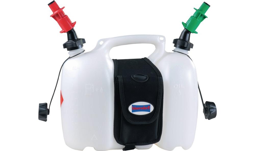 aus HD-PE · natur · für Kraftstoff und Kraftstoffgemisch zum Betrieb von Kleinmotoren in Motorsägen und Rasenmähern usw. · mit 3 Liter Ölbehälter für Schmiermittel (z.B. Kettensägenhaftöl) · mit UN-Zulassung nach ADR/GGVSEBLieferung komplett mit einem Auslaufrohr, mit schwarzer Satteltasche, mit Einfüllsystemen für Kraftstoffe rot und Kettenhaftöle grün