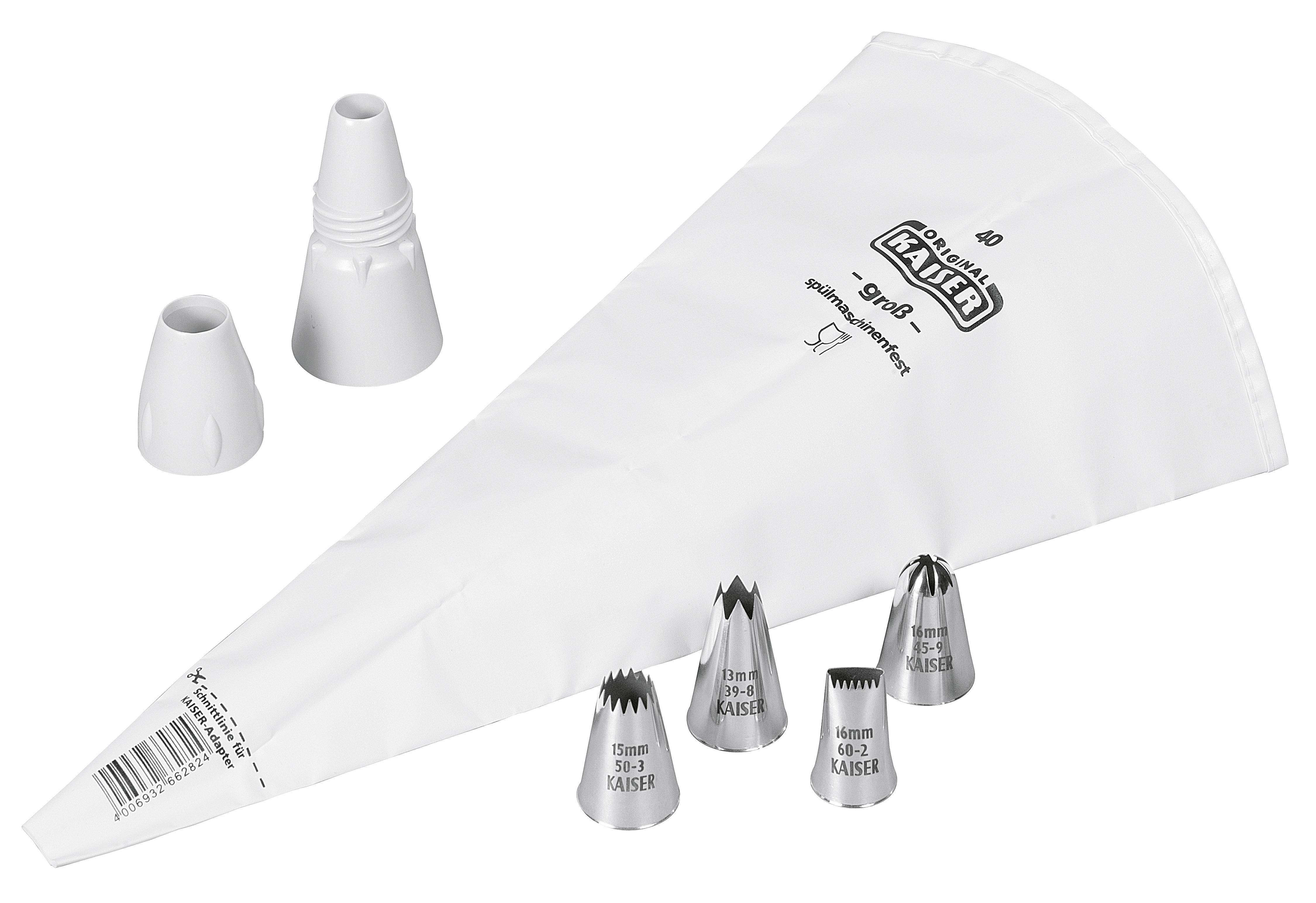 Inhalt: 1 x kochfester Spritzbeutel 40 cm, 1 x Adapter, 5 x Edelstahltüllen aus einem Stück gezogen (Lochtülle ø 13 mm, Sterntülle ø 13 cm, Sterntülle geschlossen ø 16 cm, Kronentülle ø 15 mm, Sternbandtülle ø 16 cm), erweiterbar mit jeder Edelstahltülle des Original-Kaiser Creativ Deko-Center-SortimentesLieferumfang: