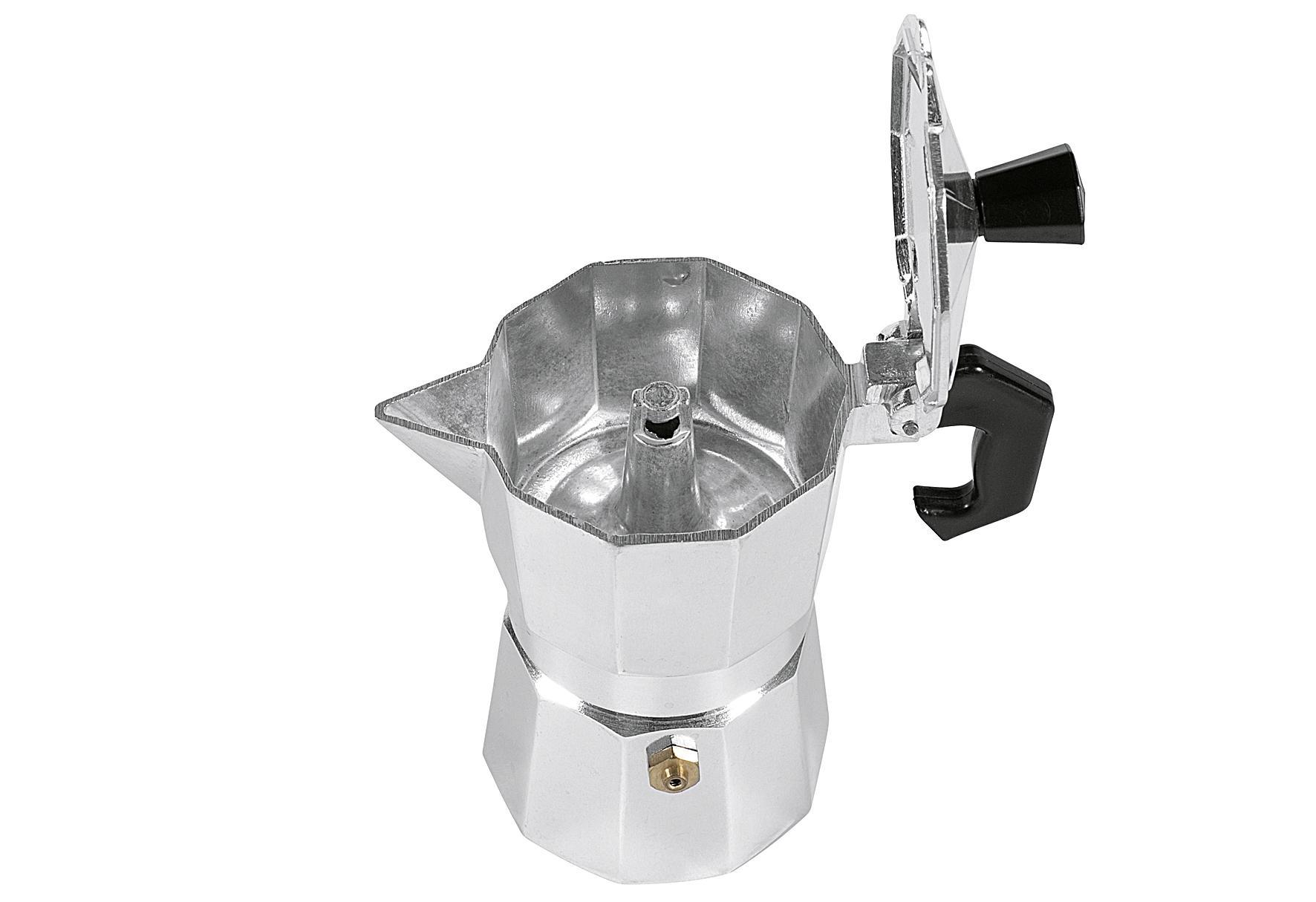 Für ein italienisches Erlebnis empfiehlt sich der Espressokocher für 1 Tasse. Er besteht aus langlebigem Aluminium und hat ein geringes Eigengewicht. Der handliche Espressokocher kann auch mit in den Camping-Urlaub genommen werden. Die Espressokanne besteht aus drei Teilen: einem Wasserkessel, einem aufschraubbaren Kannenoberteil inklusive Überlauftülle und einem Trichtereinsatz für Kaffeepulver. Sie kann sowohl auf einen Gas-, Kohle- oder Elekroherd sowie auf Glaskramik-Kochfelder gestellt werden. Maße: Ø 6 cm, H 13 cm.Attribute